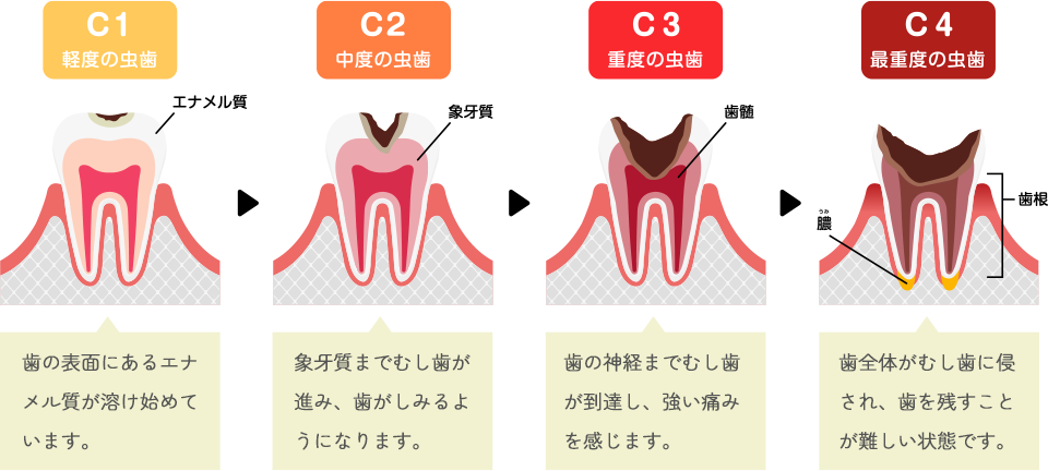 むし歯治療は、その進行度合いで治療内容が大きく変わります。初期むし歯にはフッ素塗布で修復を試みますが、中度のむし歯となると歯を削る量は大きく増えてしまいます。また重度の治療では根管へのアプローチが必要となり、やむなく抜歯となってしまうことも。できるだけ早期に発見し、早期に治療を開始することが大切です。